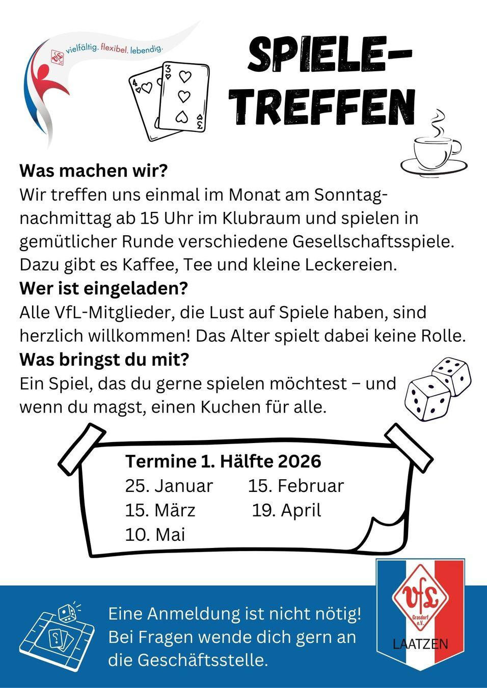 Die Spieletreffen des VfL Grasdorf finden einmal im Monat sonntags ab 15 Uhr im Klubraum statt. Für 2026 gibt es neue Termine: