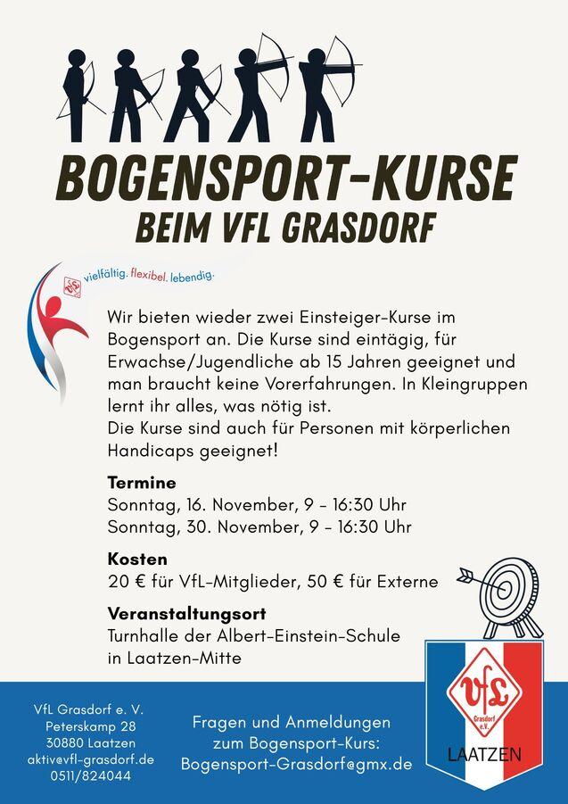 Die Bogensport-Abteilung des VfL Grasdirf bietet im November wieder zwei Einsteiger-Kurse im Bogensport an. Die Kurse sind eintägig und ideal, um Bogensport entspannt kennenzulernen.