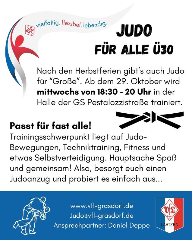 Denn nach den Herbstferien gibt es jede Woche Judo-Training für "Große". Alle ü30 sind willkommen, der Trainingsschwerpunkt liegt auf Judo-Bewegungen, Technik, Fitness und etwas Selbstverteidigung. Und Spaß!