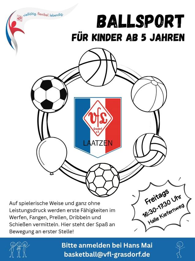 Ab sofort gibt es jeden Freitag von 16:30 Uhr bis 17:30 Uhr ein tolles Angebot für alle Kinder ab 5 Jahren, die Spaß an Bällen haben! In der Turnhalle am Kiefernweg werden erste Fähigkeiten im Werfen, Fangen, Pressen, Dribbeln und Schießen vermitteln - ohne Druck und mit viel Bewegungsfreude!