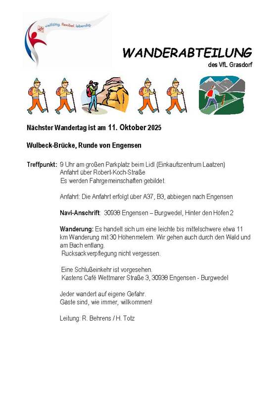 Der nächste Wandertag ist am 11. Oktober nach Wulbeck-Brücke (Runde von Engensen)
