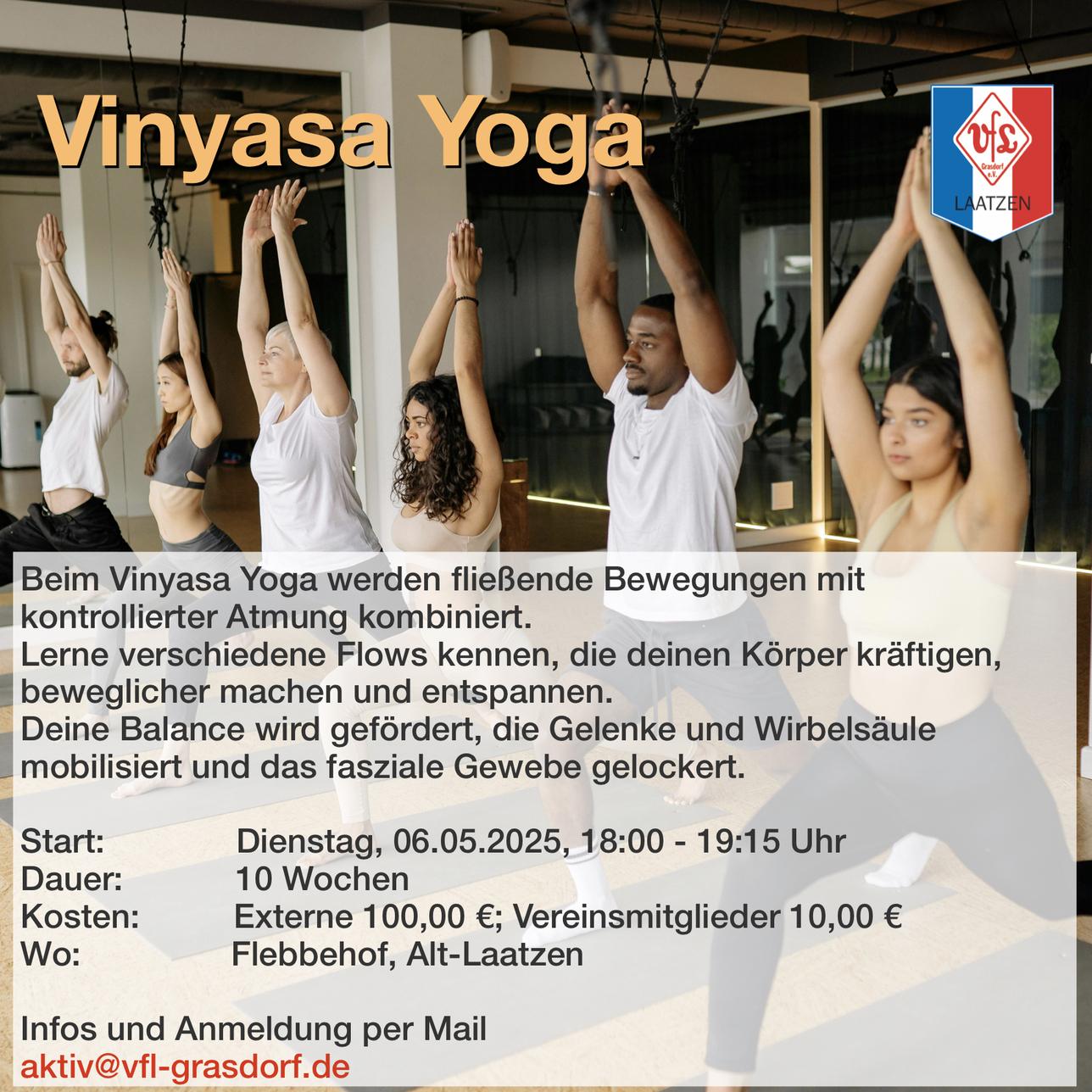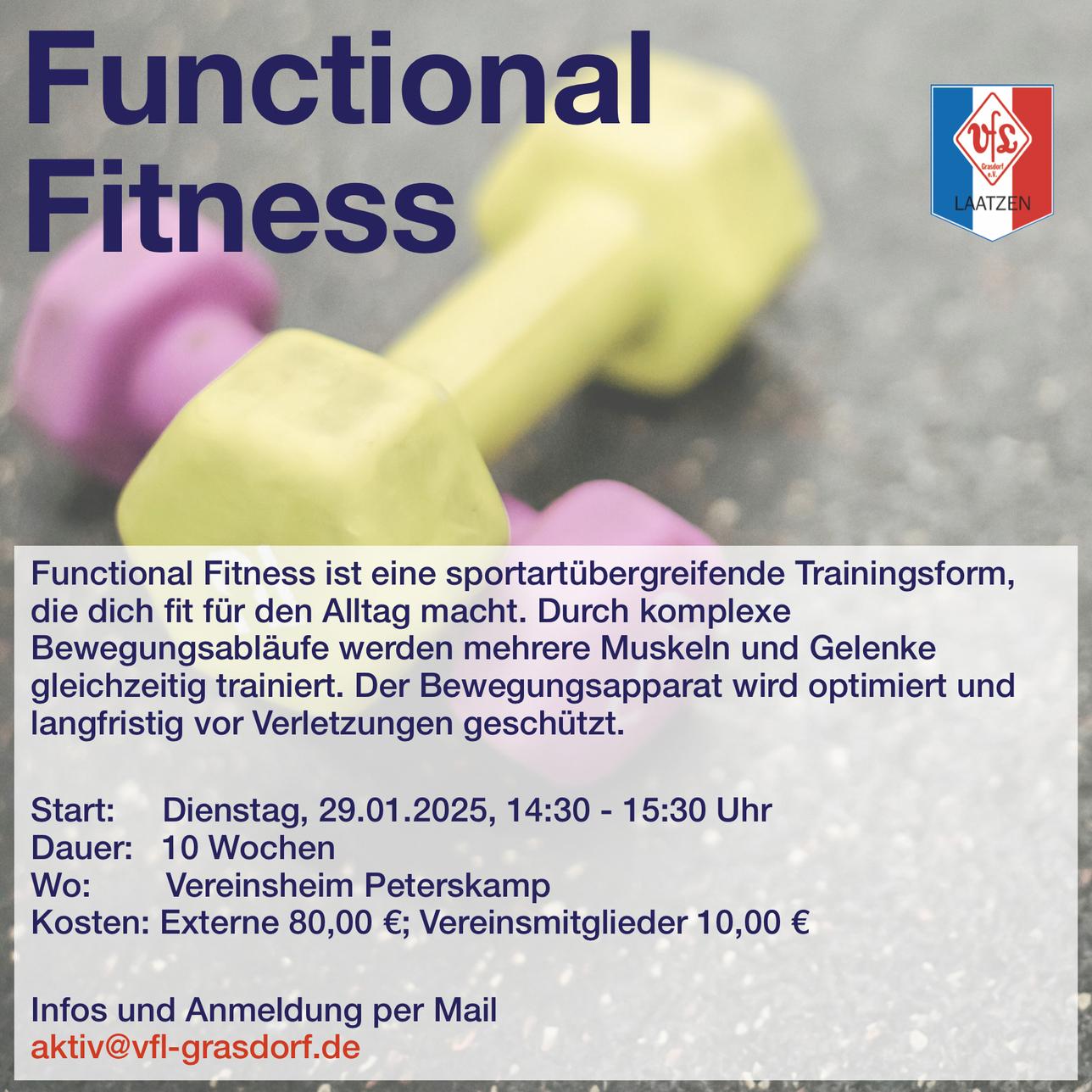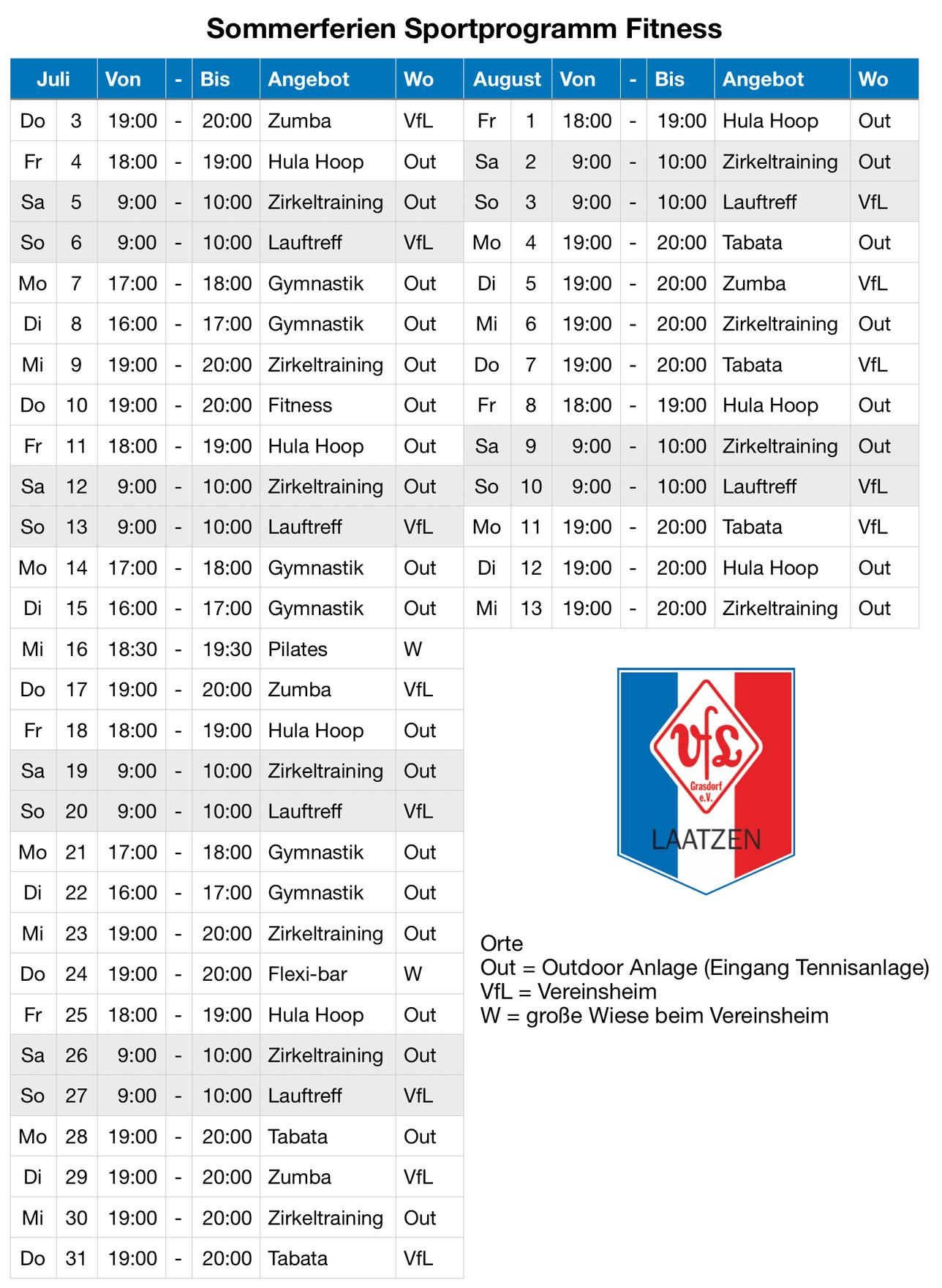 Infos Sportart:Fitness Alter:16 – 99 Jahre Ort Turnhalle Ohestraße Ohestr. 30880 Laatzen Deutschland Turnhalle Ohestraße Termine | Mittwoch | 19:00 – 20:00 | Turnhalle Ohestraße | | Samstag | 09:00 – 10:00 | VFL Grasdorf Vereinsheim |