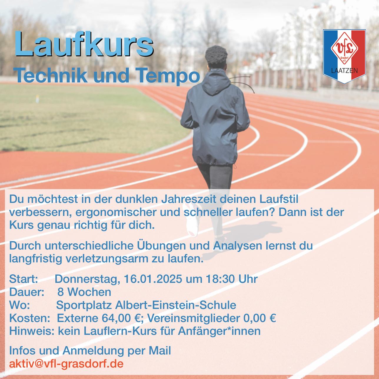 Lauftechnik & Krafttraining für Läufer*innenIn diesem Kurs machen wir die Basisarbeit damit du langfristig verletzungsarm Laufen kannst. Zu Beginn jeder Stunde werden Technikübungen wie das Lauf-ABC durchgeführt, gefolgt von einem Krafttraining speziell für die Laufmuskulatur und Gelenke.