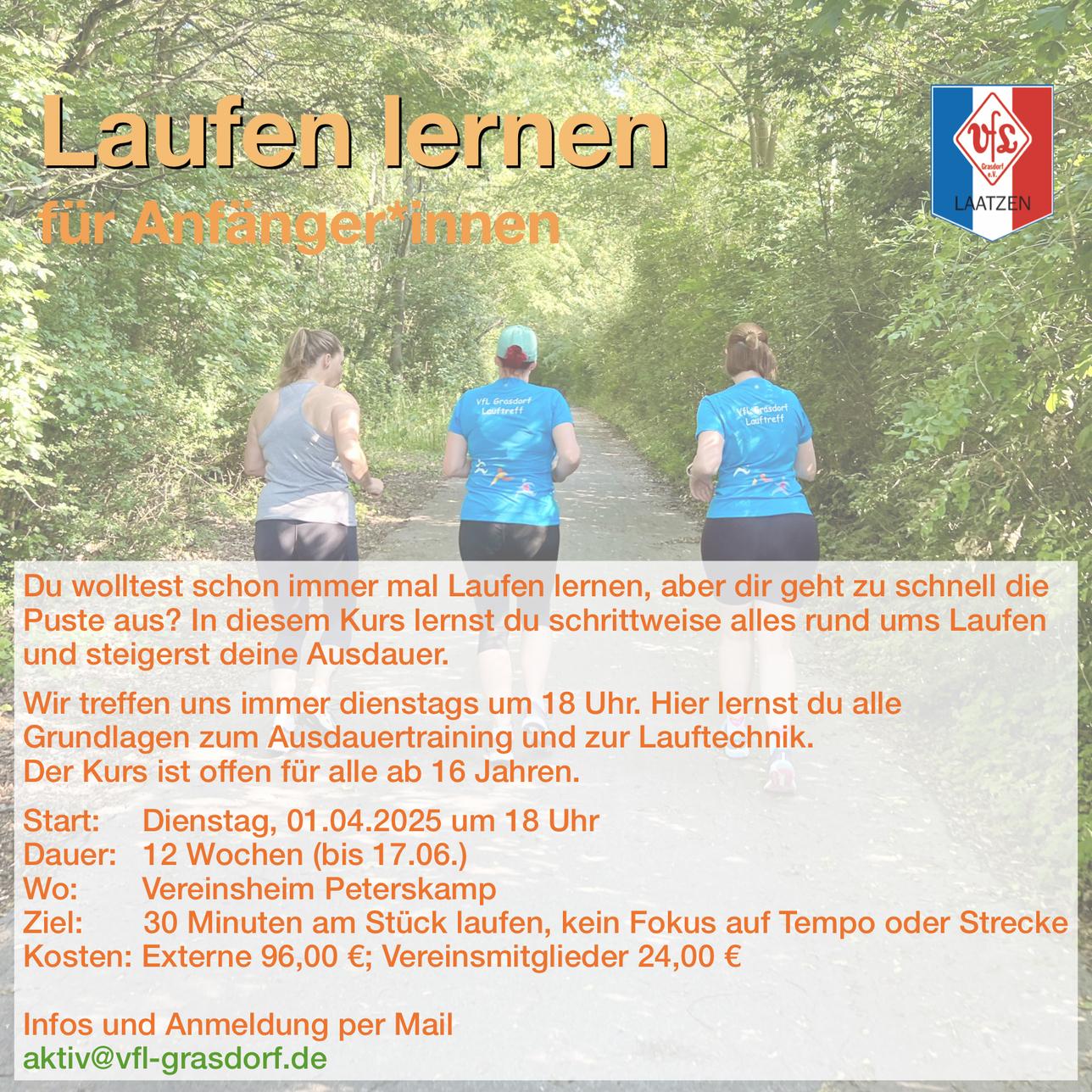 LauftreffWir laufen kleine und größere Runden im gemäßigten oder schnellen Tempo in der Masch, am Kornsberg und auf dem Sportplatz. Einmal jährlich findet ein Lauflern-Kurs (nächster Kursstart 08.01.2026).
