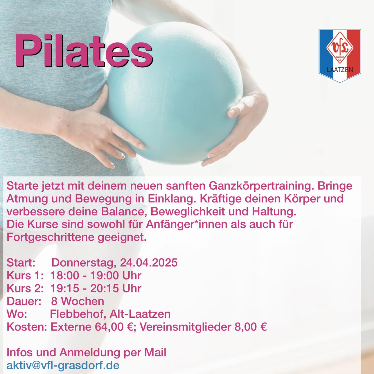 Pilates"Nach 10 Stunden fühlst du den Unterscheid. Nach 20 Stunden sieht man den Unterschied. Nach 30 Stunden hast du einen neuen Körper" - Joseph H. Pilates Pilates ist für alle geeignet, die an einem entspannten und körperbewussten Gymnastiktraining teilnehmen möchten. Ganz gezielt werden die tiefliegenden und schwach ausgeprägten Muskelpartien trainiert, entspannt und gedehnt. Im Fokus liegt die richtige Atmung und die Konzentration auf die Körpermitte, dem "Powerhouse". Durch die Aktivierung dieses Kraftzentrums wird die Bauchmuskulatur gekräftigt, der Rücken stabilisiert und eine aufrechte Haltung gefördert. Komm vorbei und genieße ein abwechslungsreiches Training in entspannter Atmosphäre.