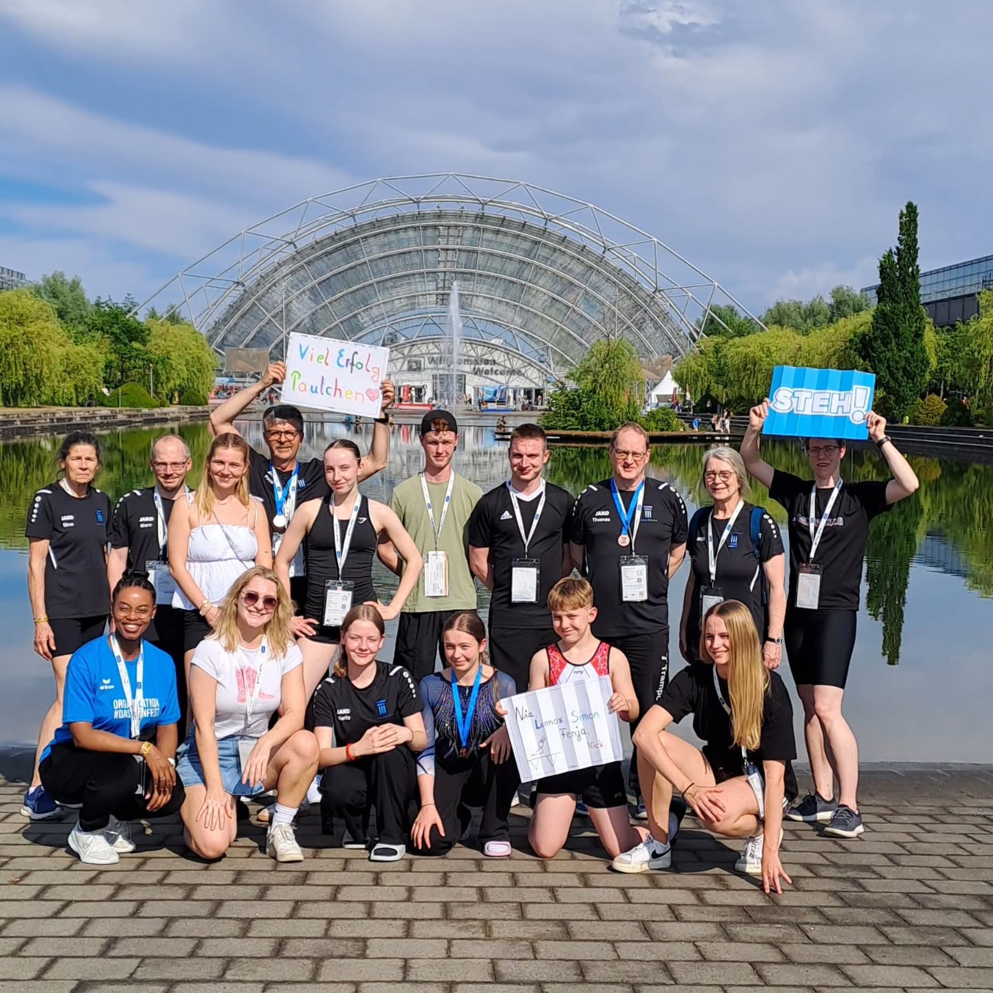 Teilnehmer und Kampfrichter der Gymcity Open in Cottbus. Pauline Gretzinger und Nick Kloppenburg erreichten das Finale. Platz 8 für Pauline und Platz 4 für Nick mit nur 0,065 Zehnteln Rückstand auf Platz 3.