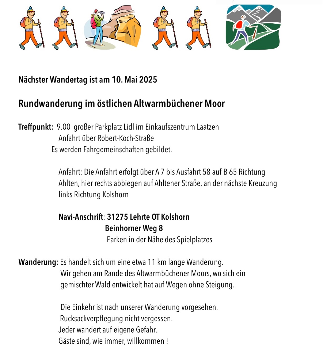 Treffpunkt: 9.00 großer Parkplatz Lidl im Einkaufszentrum Laatzen